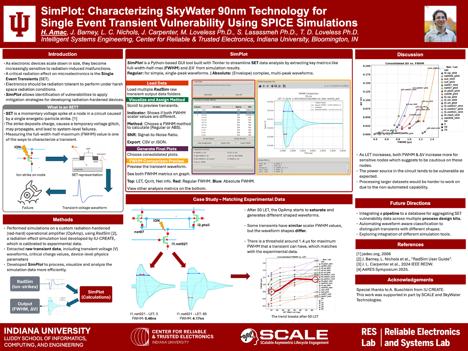 Huseyin Amac is an Intelligence Systems Engineering undergraduate student at Indiana University, specializing in the characterization of Single Event Effects (SEE) at IU CREATE. Modeling of radiation-induced charge deposition and transient propagation is conducted using SPICE simulations, specifically targeting Single Event Transients (SET) and Upsets (SEU). Direct field experience includes a 25-hour heavy-ion experiment at the Lawrence Berkeley National Laboratory’s 88-inch Cyclotron.